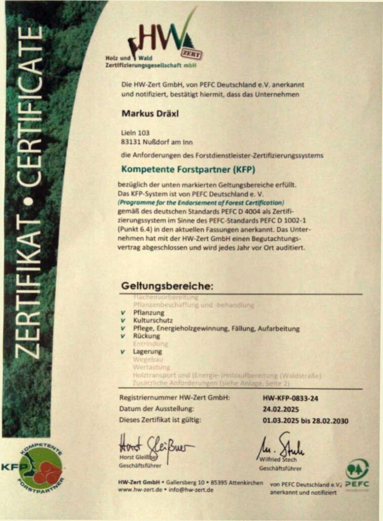 Das KFP-System wurde von PEFC Deutschland e. V. (Programme for the Endorsement of Forest Certification) gemäß des deutschen Standards PEFC D 4004:2014 als Zertifizierungssystem im Sinne des PEFC-Standards PEFC D 1002-1:2014 (Punkt 6.4) anerkannt.